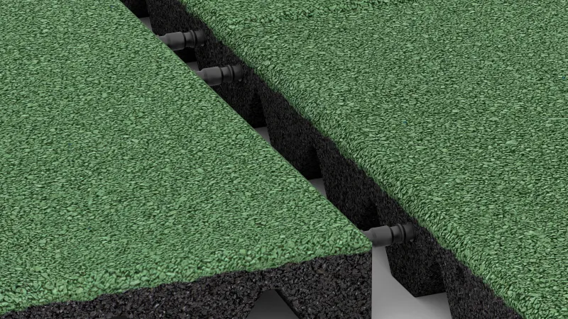 Otvorená štruktúra EPDM-povrchu je odolná voči UV, protišmyková a odolná proti oderu – aj na mokrom povrchu. Povrch je príjemný na dotyk a vhodný na použitie v zónach s priamym telesným kontaktom. Spodná strana z granulátu ELT je tvarovaná do obrátených komolých pyramíd, ktoré zlepšujú tlmenie nárazov, podporujú odvod vody a urýchľujú schnutie – praktické pri meniacich sa poveternostných podmienkach.