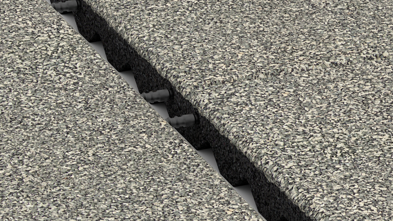Na vonkajšie použitie odporúča WARCO stabilnú a priepustnú podkladovú vrstvu. Osvedčenými riešeniami sú plastové voštinové rošty (napr. dlaždice na štrk) alebo viazaný drenážny podklad ako napr. drenážny betón. Ak podklad nie je vodopriepustný, je potrebný sklon min. 1,5 % na zabezpečenie odtoku vody. Pokládka na piesok, štrk alebo drvený kameň sa neodporúča – sypké materiály sa pod elastickými dlaždicami posúvajú a spôsobujú nestabilitu.