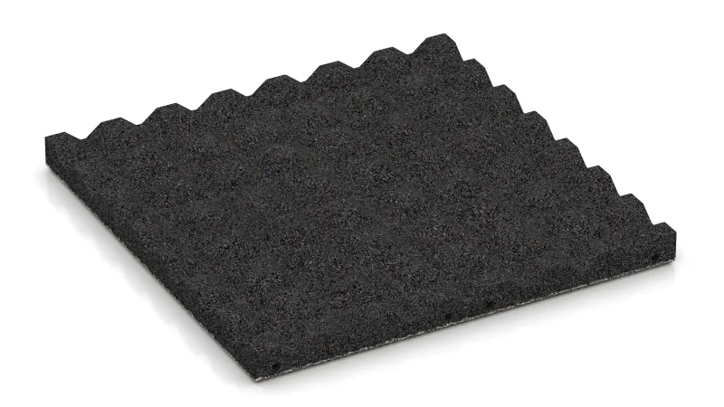 Podložky sú vyrobené z PU-pojeného gumového granulátu s pružným, protišmykovým povrchom. Hrúbka a hustota určujú tlmenie nárazov a certifikovanú výšku pádu podľa EN 1177. Formát 50 × 50 cm minimalizuje odpad pri rezaní a jednotlivé podložky je možné v prípade potreby jednoducho vymeniť.
