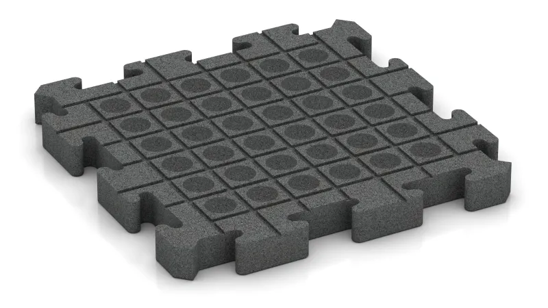 Každá podložka je vybavená presne tvarovaným puzzle spojom, ktorý umožňuje jednoduché a presné spojenie. Obvodová fáza zabezpečuje čistý a usporiadaný vzhľad škár a dodáva povrchu kvalitný vzhľad. Výsledkom je stabilný, pevne spojený povrch z dlaždíc.