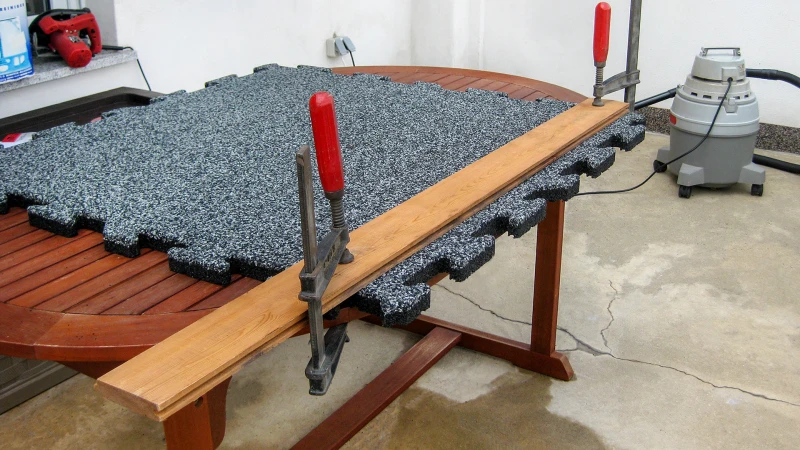 In principle, fall protection mats or other slabs made of rubber granulate can be processed in a similar way to solid wood. They can be sawn precisely, mitre cuts can be made, the material can be drilled and even milled. With the right tools, you can cut quickly and safely.