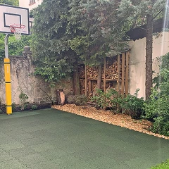 For a basketball hoop on the house wall or carport, simply lay 18 mm thick sports floor panels on the concrete interlocking pavement or driveway asphalt.