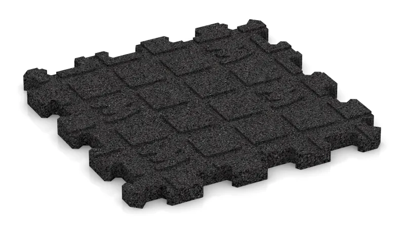 Dlaždice sa vyrábajú z gumového granulátu spojeného polyuretánom. Veľké bloky sa lisujú, nechajú vytvrdnúť a následne sa presne režú. Tak vznikajú kalibrované prvky s presnými rozmermi a jednotným povrchom – čo uľahčuje montáž a zaisťuje kvalitný vzhľad povrchu.